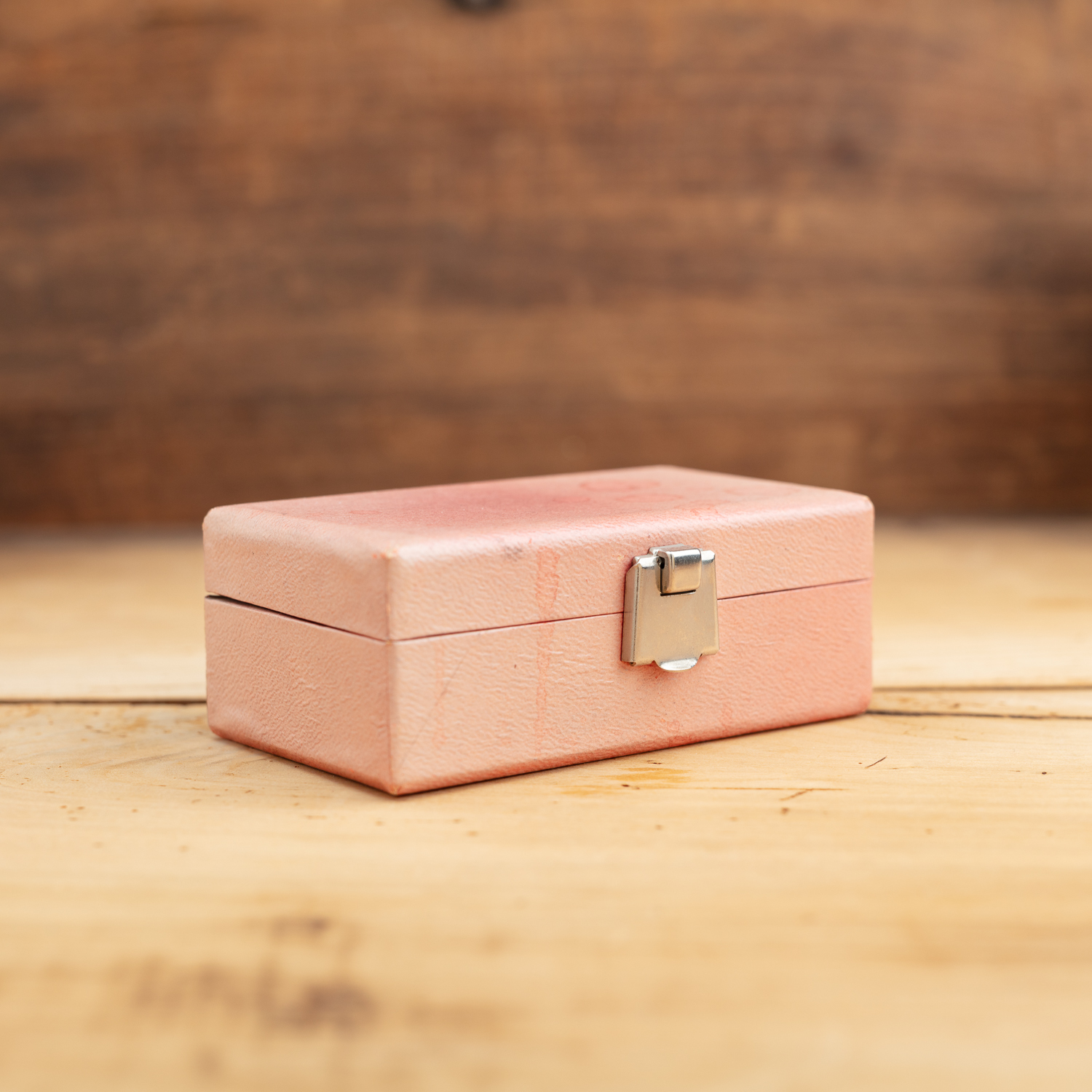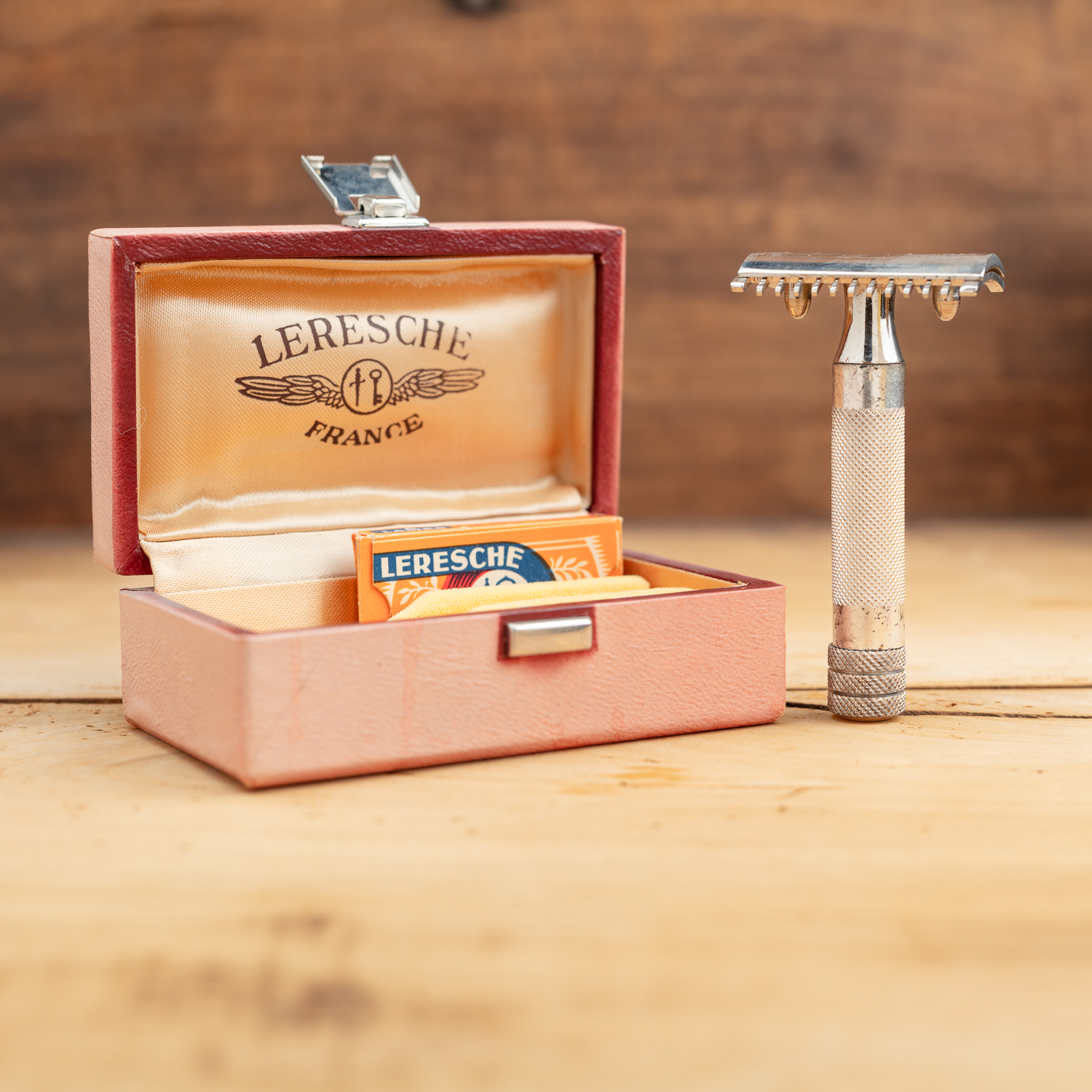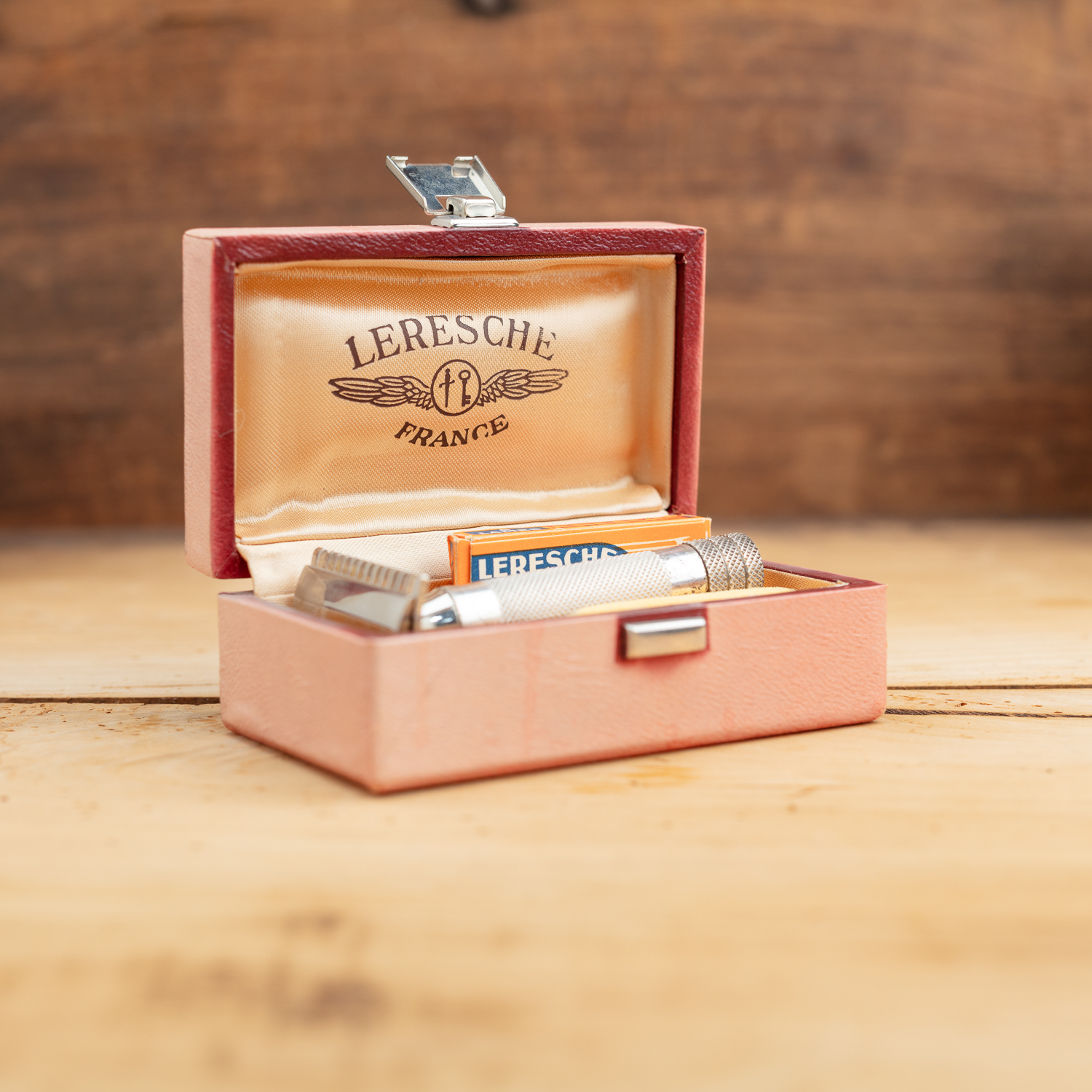 Le rasoir est livré dans son coffret d’époque de couleur rosé saumon. Certes, celui-ci présente quelques traces de décoloration liées au stockage, mais cela n’altère en rien son charme ni son usage. Un paquet de lames anciennes Leresche est inclus, pour un clin d’œil à l’histoire de ce bel objet.